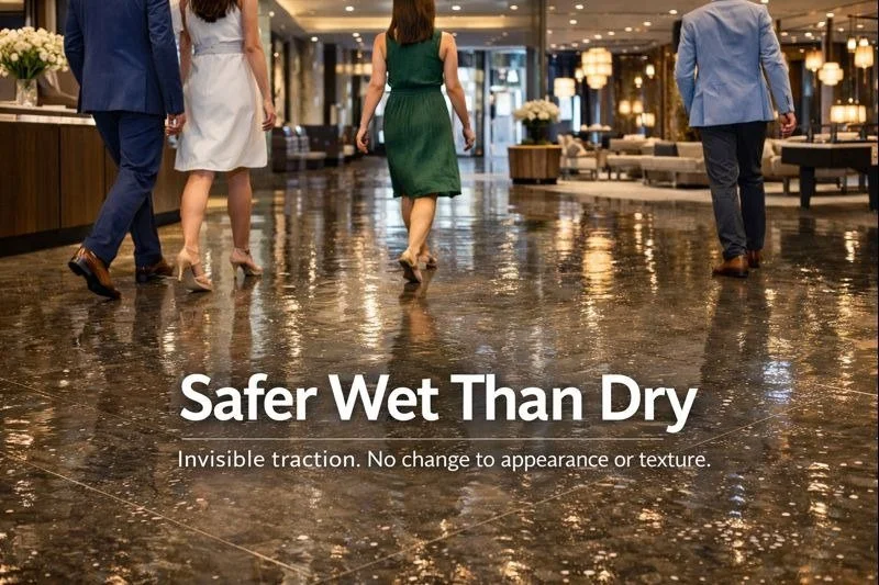 We make floors safer wet than dry by creating microscopic recesses within the surface that form an invisible tread, improving traction without changing the floor’s appearance or texture.